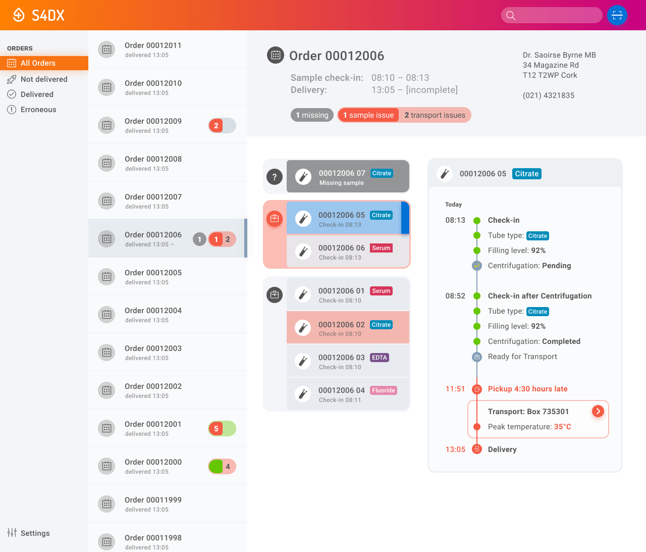 I prototyped the interfaces of a sampling machine to be operated by practice staff, and a lab dashboard. The sampling machine checks for correct categorization as well as additional preparational requirements like centrifugation. The lab dashboard browses all sampling transactions and gives detailed status reports for individual samples and transport batches.